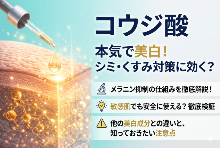 最近、鏡を見るたびにシミやくすみが目につくようになった、という人は少なくない。紫外線の蓄積、加齢、ホルモンバランスの変化、さまざまな要因が重なって、肌の色ムラは少しずつ進んでいく。それを何とかしたいと思って成分を調べ始めると、ハイドロキノンという名前が出てくる。しかし刺激が強いと聞いて躊躇する。そうして次に行き着くのが、コウジ酸という名前だ。 「コウジ酸は安全らしい」「麹から作られるから自然派向け […]