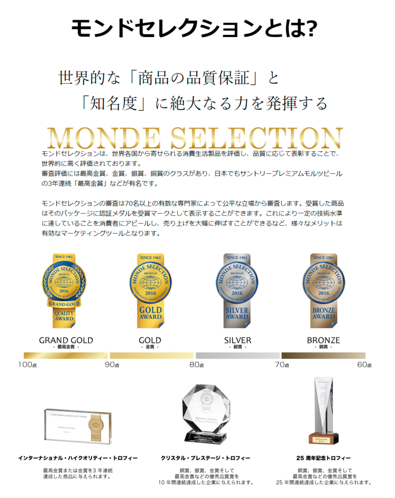 重要なのは、モンドセレクションは「コンテスト」ではなく「品質評価」である点です。つまり、製品同士を比較して順位をつけるのではなく、それぞれの製品が設定された基準をどの程度満たしているかを評価する仕組みになっています。したがって、理論上はすべての出品製品が金賞を受賞することも、逆にすべてが不合格となることもあり得るのです。